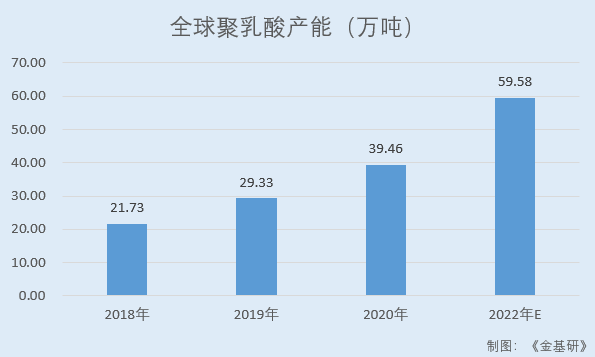 据欧洲生物塑料协会数据,2018-2020年,全球聚乳酸产能分别为21.73万吨、29.33万吨、39.46万吨,年均复合增长率34.76%。预计2022年全球聚乳酸产能将达到59.58万吨。