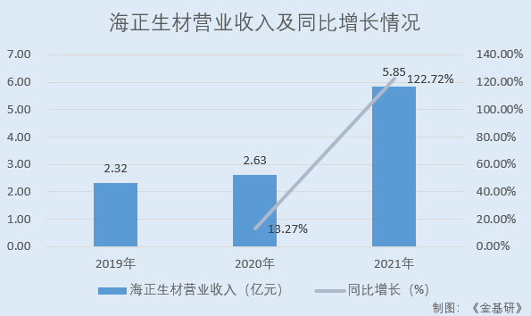 据招股书,2019-2021年,海正生材的营业收入分别为2.32亿元、2.63亿元、5.85亿元,2020-2021年分别同比增长13.27%、122.72%。