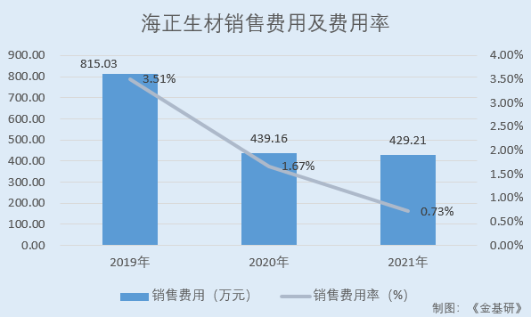据招股书,2019-2021年,海正生材的销售费用分别为815.03万元、439.16万元、429.21万元,占营业收入比例分别为3.51%、1.67%、0.73%。2020年,由于新收入准则将运输保险费调整至成本,销售费用出现下滑。