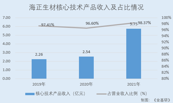 2019-2021年,海正生材核心技术产品形成的营业收入分别为2.26亿元、2.54亿元、5.75亿元,占营业收入的比例分别为97.41%、96.60%、98.37%。