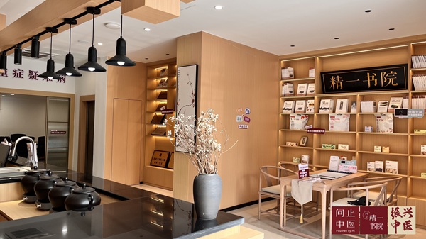 一楼大厅宽敞明亮,进门口左手边的煮茶区弥漫着阵阵茶香,工作人员正在精心煮制沙参麦冬茶,夏天还会准备酸梅汤。右手边的精一书院学习区摆放着许多中医书籍,吸引人们驻足翻阅。