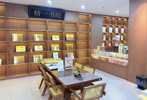 左手边的休息区域则实现了“等候区+文化体验区”的功能融合:靠墙展架陈列着问止中医获得的系列荣誉;中间展架摆放着针对不同体质研发的问止轻养系列养生产品;旁边书架上的大医小课系列书籍,让市民在等候之余可随手翻阅学习养生知识。